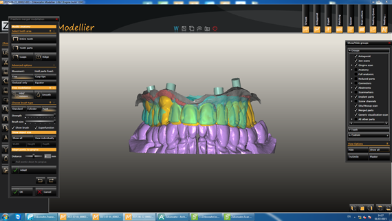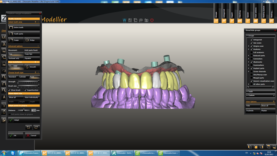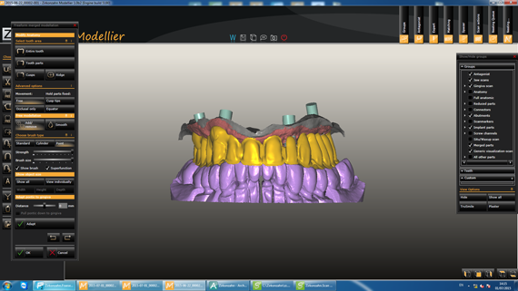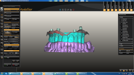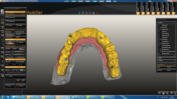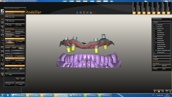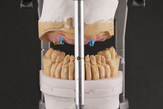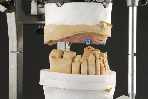STEP1 CAD-CAM Simulation of implant location, titanium bases, gingiva and antagonist (finished lower zirconia bridge). |